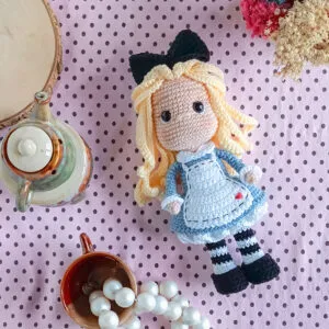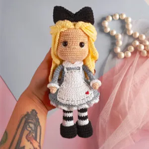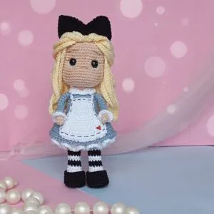 PDF com passo a passo, fotos, descrição de materiais e vídeos de apoio, contendo: receita para confeccionar a boneca Alice.