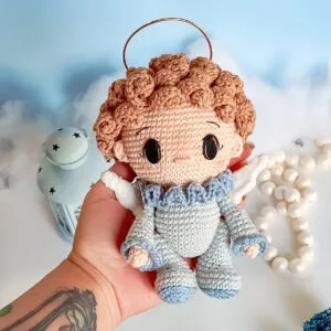 PDF com passo a passo, fotos, descrição de materiais e vídeos de apoio, contendo: receita de amigurumi para confeccionar o anjinho Biel.