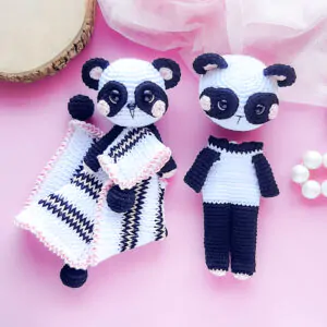 PDF com passo a passo, fotos, descrição de materiais e vídeos de apoio, contendo: receita do boneco Jimi, receita dos pijamas de panda e sapo, receita do chapéu de panda e sapo. Bônus: receitas das naninhas de panda e sapo.