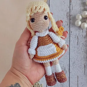 Maria: Se confeccionado com o material indicado (linha amigurumi tradicional e agulha 2mm) a boneca ficará com, aproximadamente, 18 cm.